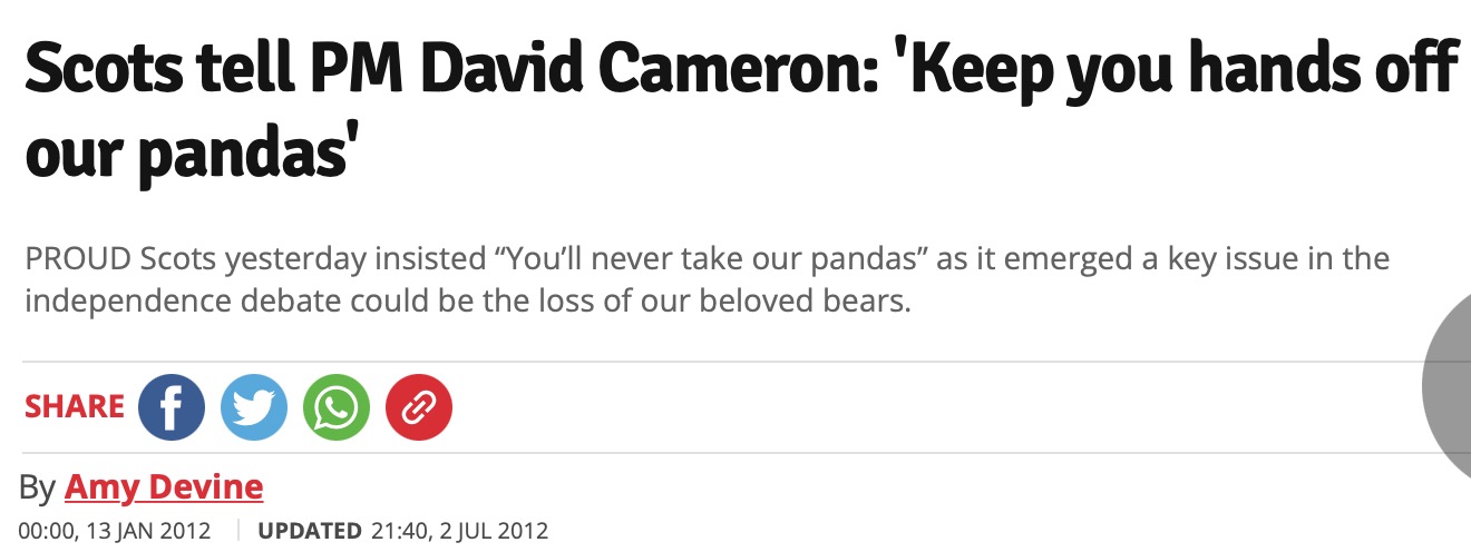 对熊猫的热爱并非日本人独有。2013年,在比利时,因为从中国租借的熊猫被安置在比利时南部的动物园,素来不和的南部法语区和北部荷兰语区之间再度出现政治斗争。无独有偶,2014年苏格兰独立公投时,熊猫的归属也成为一大问题——当时住在苏格兰爱丁堡动物园的熊猫“天天”和“杨光”实际上是由中国赠送给英国政府的,苏格兰独立后应归还熊猫,当时的一则新闻标题是这样的:“Scots Tell PM David Cameron: ‘Keep You Hands Off Our Pandas’”(苏格兰人告诉卡梅伦:不要碰我们的熊猫)。