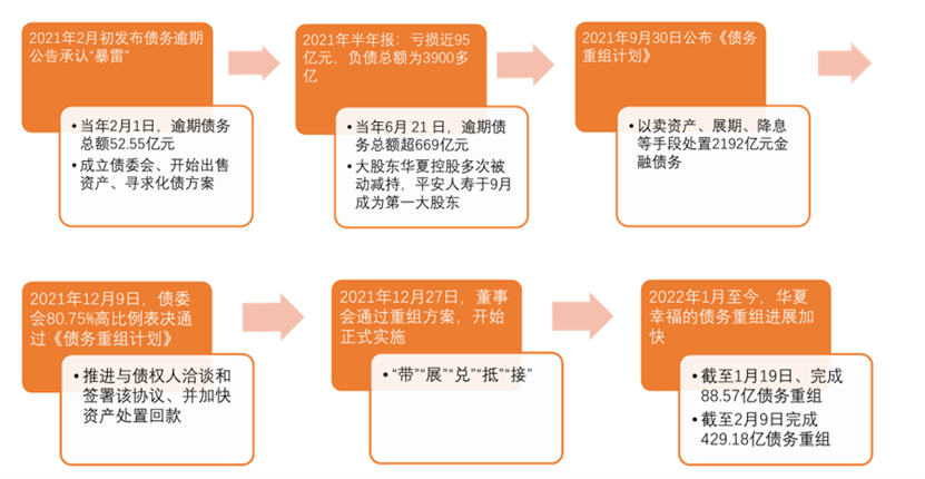 2021年12月27日,华夏幸福开始实施《债务重组计划》,对债务将通过以下几种方式偿还:“带”(出售资产带走金融债务500亿)、 “展”(优先类金融债务展期或清偿约352亿)、“兑”(出售资产回笼资金中约570亿元用于兑付金融债务)、“抵”(以持有型物业等资产建立信托,以受益权份额抵偿)、 “接”(剩余约550亿元金融债务由华夏幸福承接并逐步清偿)。
