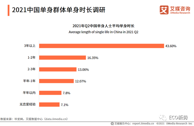 据艾媒咨询《2021中国单身群体消费行为调查及单身经济趋势分析报告》显示,2021年Q2,在中国单身时长以年为单位的单身人士已高达 73.01%,其中有43.60%的单身人士单身时长为3年以上;7.1%的人无恋爱经验。而从单身原因调查结果来看,主动性选择享受单身生活或不着急恋爱为单身群体最主要的单身原因,占比高达45.9%。