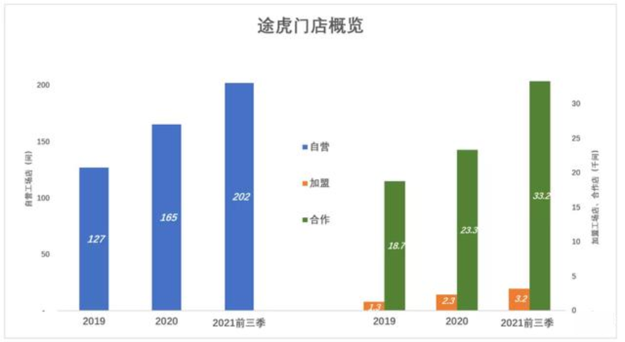 途虎的线下门店分为三类:直营店、加盟店、合作店,三种门店与途虎的关系由高到低:直营店由途虎独立开店运营;加盟店由别人出钱加盟,店里用途虎的供应链和工人,交一点加盟费和利润分成;合作店最简单,普通汽修店直接在途虎开店,有单接单,无单做自己的生意。