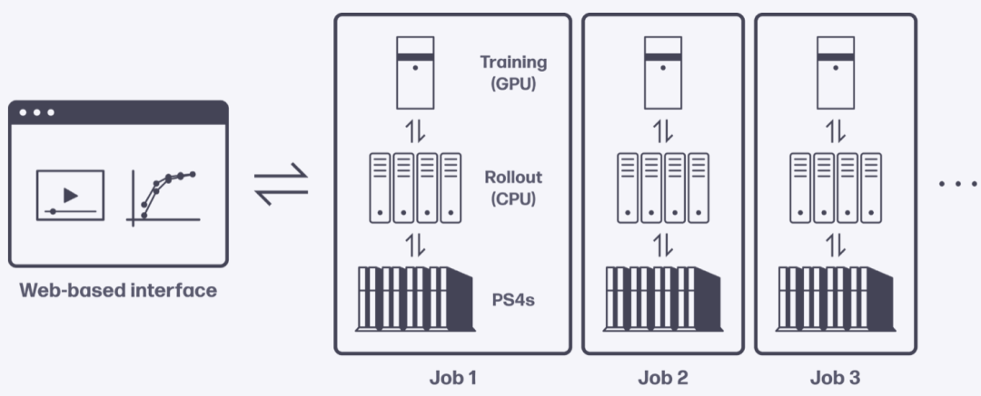 GT Sophy即是在这个终极模拟环境中训练而出,同样,分布式训练平台DART也对于该AI新成果功不可没。基于这个定制平台,Sony AI研究人员能在SIE云游戏平台的PlayStation 4控制台上训练GT Sophy。DART允许研究人员轻松指定实验,在云资源可用时自动运行,并收集可以在浏览器中查看的数据。此外,该平台还管理PlayStation 4控制台、代理计算资源和GPU,用于跨数据中心的训练。它能访问1000多个PlayStation 4控制台,每个都用于收集训练GT Sophy的数据或评估训练有素的版本。该平台由必要的计算组件(GPU、CPU)组成,用于与大量PlayStation 4进行交互,并支持长时间的大规模训练。