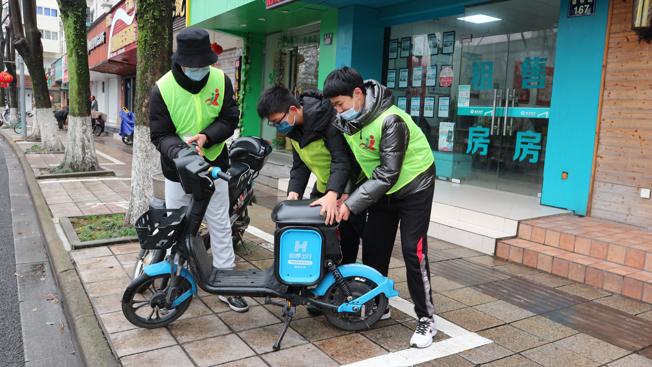 有些“小路长”已经不是第一次参加“民间路长”活动了。他们丝毫没有畏惧天气的寒冷,熟练地清理草坪和道路上的垃圾、烟头,看见路上杂乱摆放的共享单车,协力搬到停车线内整齐排列。