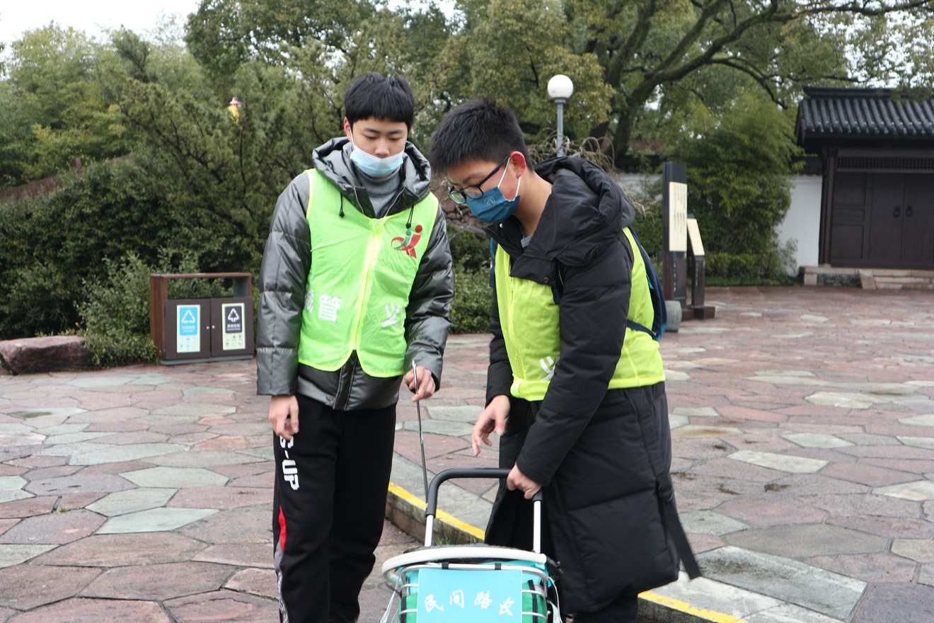 2月8日上午,在镇明路上,一群身穿“城管义工”绿马甲的“民间小路长”正熟练地扶单车、捡烟蒂、擦洗沿街公共设施。原来这几名学生都是来自东恩中学、咸祥中学的小志愿者,在海曙区“芦杰志愿服务工作室”创始人芦杰的带领下来到天一阁·月湖景区开展“民间小路长”街区守护活动。