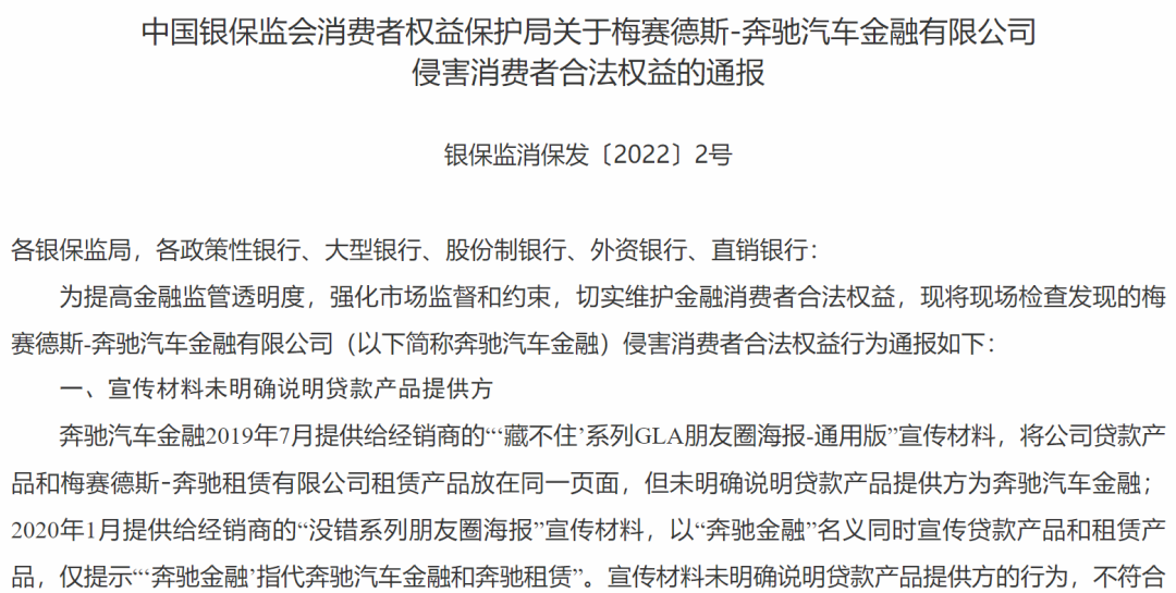 比如,此次银保监会在通告中指出,奔驰汽车金融“以‘奔驰金融’名义同时宣传贷款产品和租赁产品,仅提示‘奔驰金融’指代奔驰汽车金融和奔驰租赁”“宣传材料未明确说明贷款产品提供方的行为”。