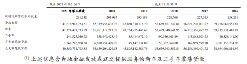 截至2021年第二季度末,奔驰金融零售业务未偿贷款本金余额837.79亿元。