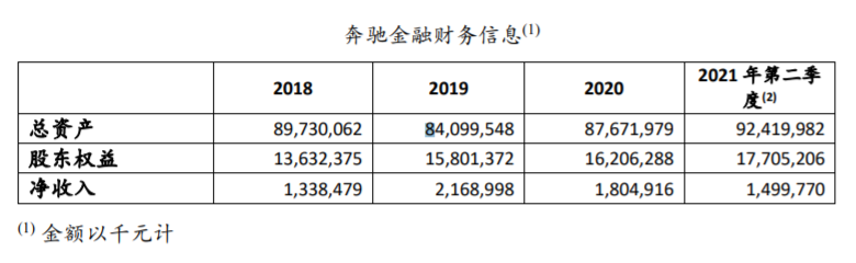报告称,2021年第二季度,奔驰金融净收入14.99亿元,未明确是否为上半年全部收入,声明数据未经审计,金额超过2018年全年净利润。据此前披露,2020年,奔驰汽车金融营业收入41亿元,同比增加约1.9%;净利润录得18亿元,同比降16%。