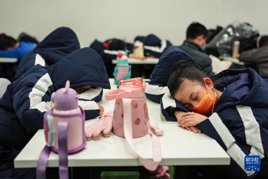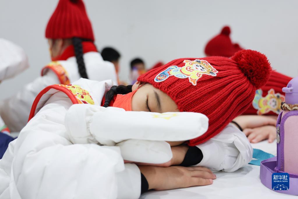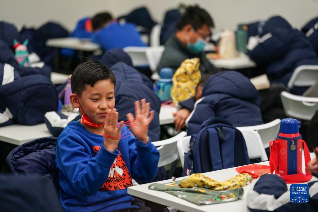 彩排前,马兰花儿童合唱团的孩子们在国家体育场(鸟巢)候场间休息(1月12日摄)。