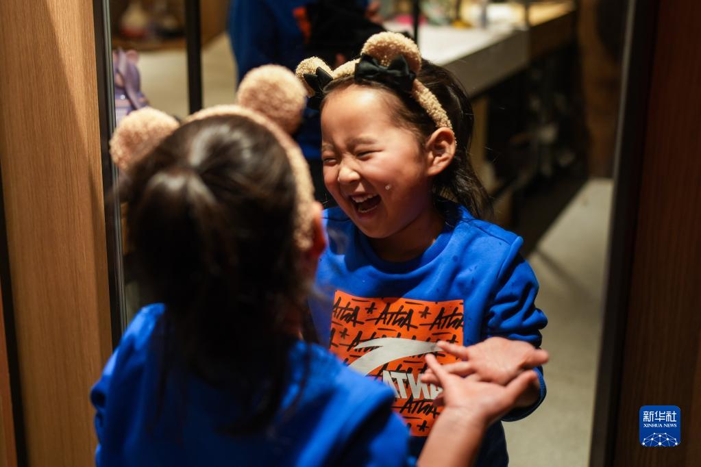 在酒店房间,马兰花儿童合唱团的韩舒心对着镜子练习笑容(1月10日摄)。