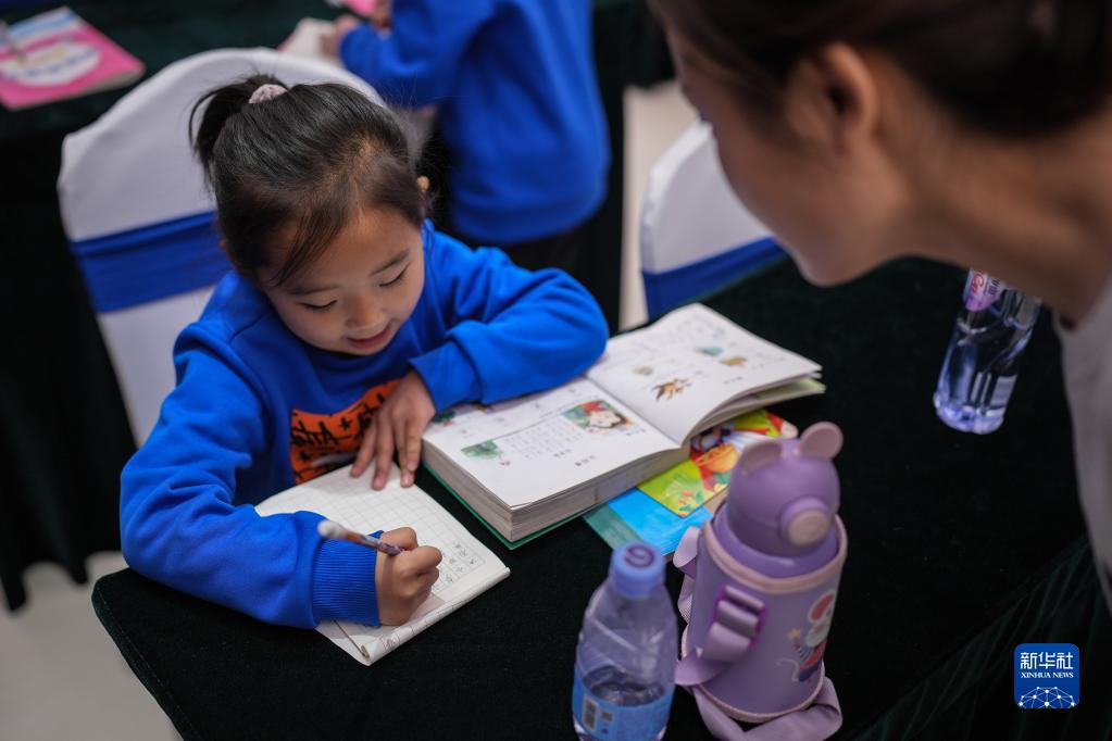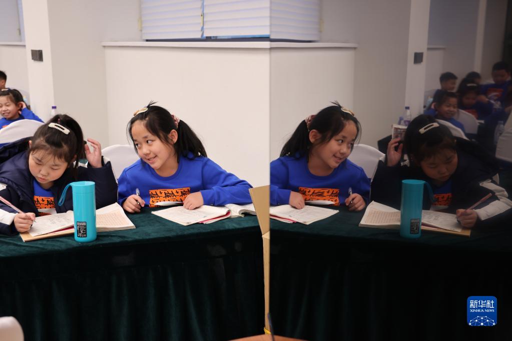 在酒店会议室,老师辅导马兰花儿童合唱团的韩舒心写作业(1月11日摄)。
