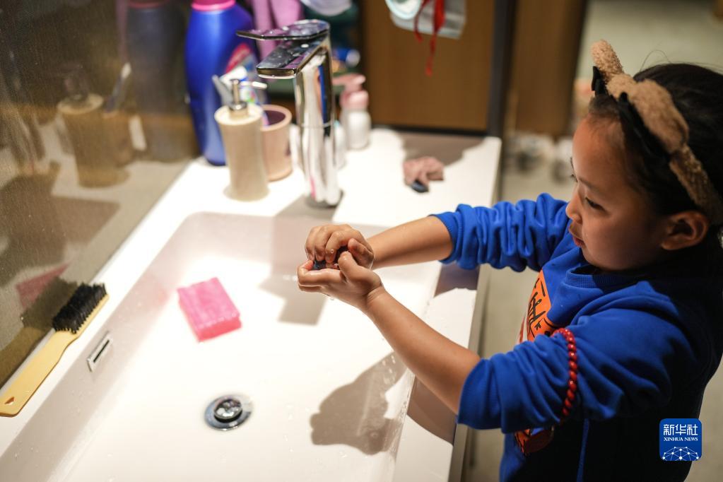 在酒店房间,马兰花儿童合唱团的韩舒心自己洗袜子(1月10日摄)。