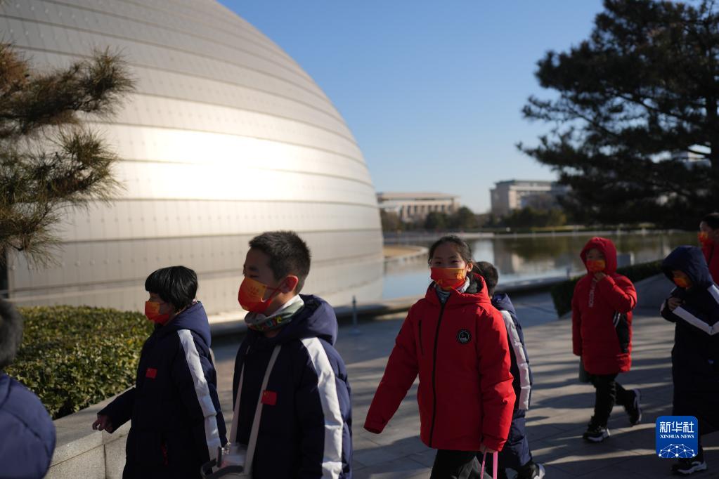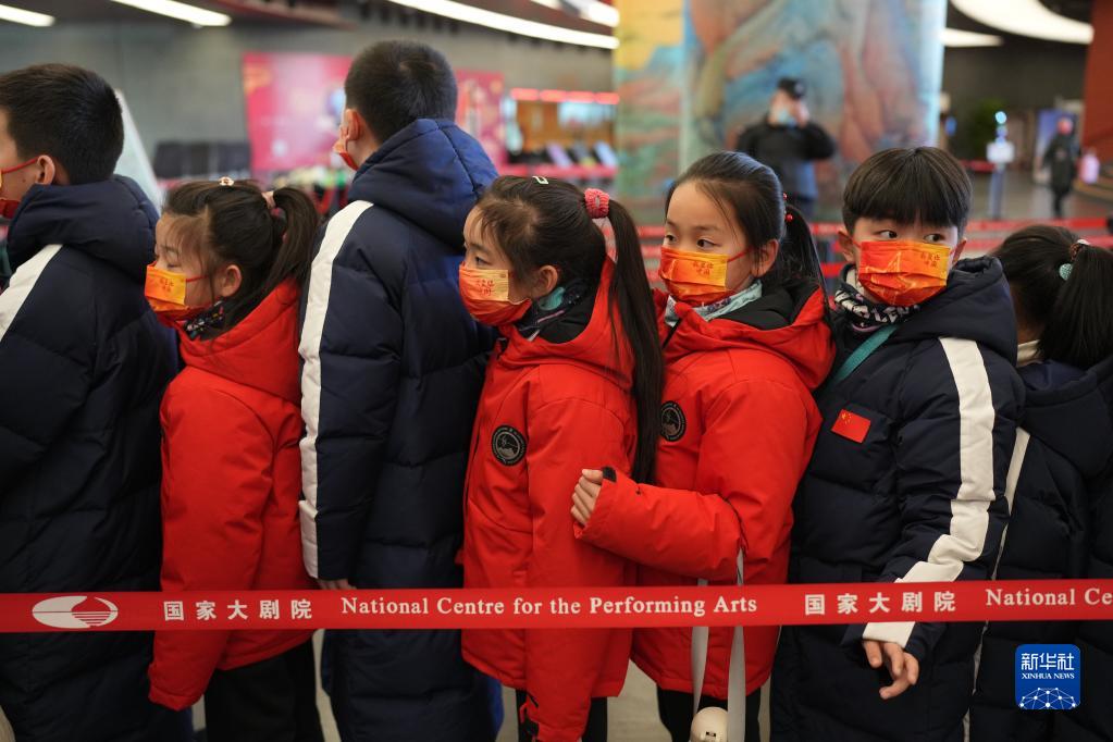 马兰花儿童合唱团的孩子们排队进入国家大剧院录音(1月17日摄)。