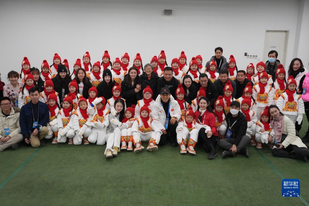在国家体育场(鸟巢)后台,马兰花儿童合唱团的孩子们与总导演张艺谋(中)合影(1月15日摄)。