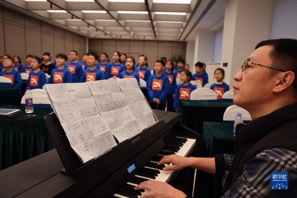 保定学院音乐舞蹈学院声乐教师王金山(右)与马兰花儿童合唱团在酒店会议室排练(1月11日摄)。
