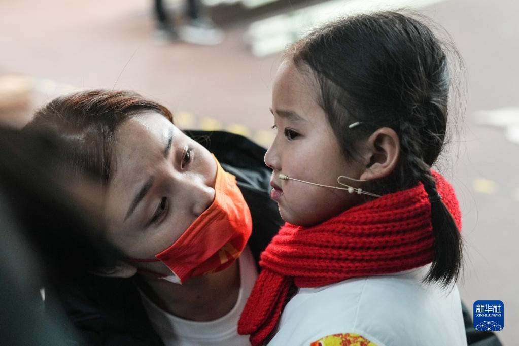 在国家体育场(鸟巢)后台,老师安慰因过敏无法上场彩排的韩舒心(右)(1月27日摄)。