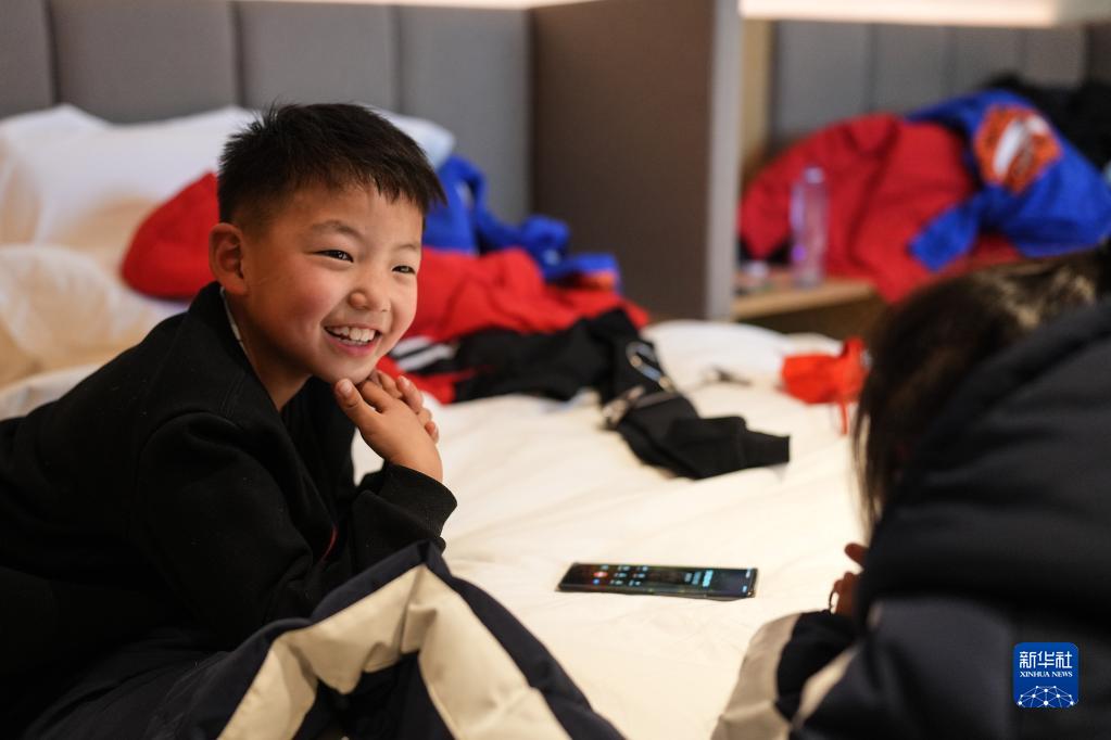 在酒店房间,马兰花儿童合唱团的孩子们给家人打电话(1月10日摄)。