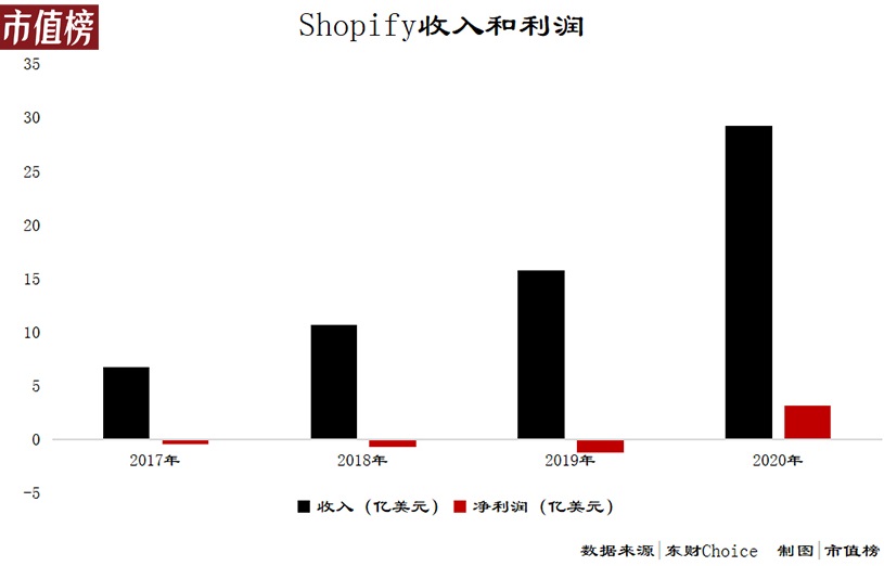 Shopify所做的正是为中小商家提供直接与消费者接触的平台,而不是间接通过亚马逊来获取流量。越来越多的商家开始自建网上商店,Shopify收入规模不断扩大,从2017年到2020年,三年收入增长超过3倍。