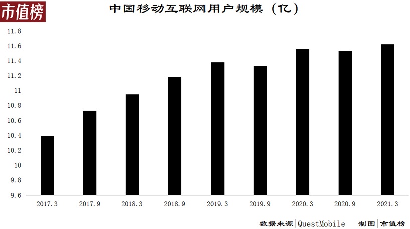 QuestMobile《2021中国移动互联网春季大报告》显示,2017年3月至2019年3月,中国移动互联网月活跃用户规模的整体增幅为10%,而2019年至2021年,整体增幅下滑至2%。
