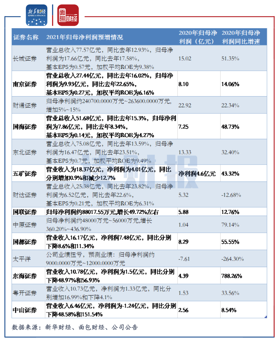 南京证券、财达证券和国联证券均预告2021年归母净利润的同比增速远超上年同期。