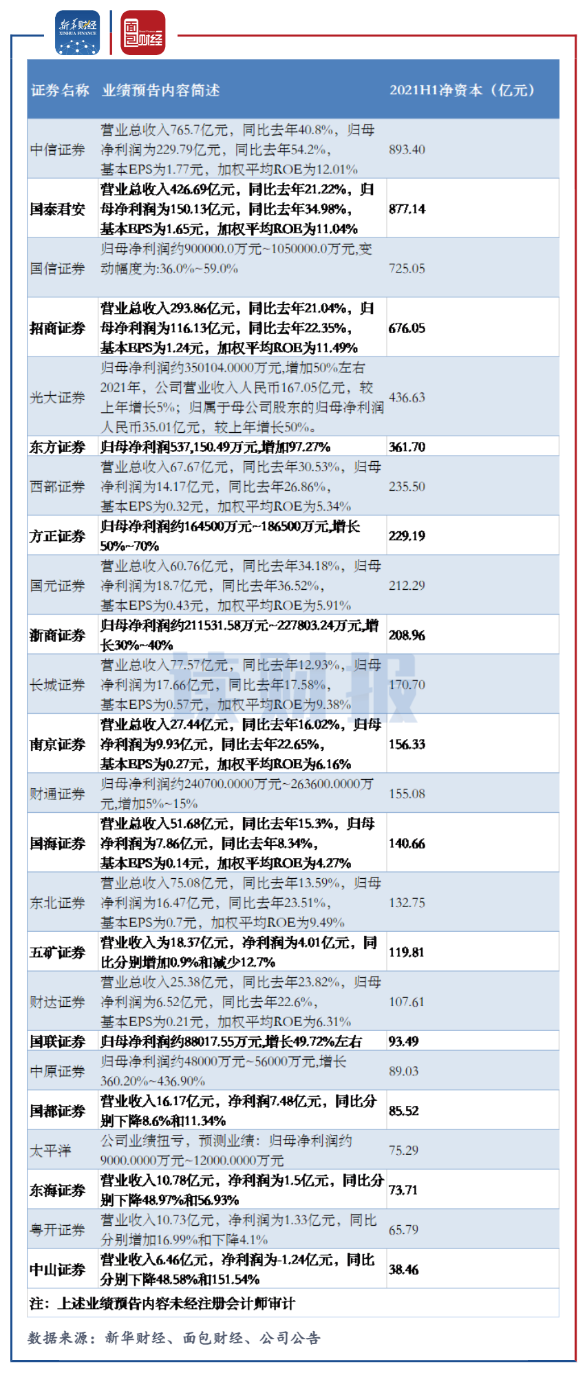 总体而言,截至2021年上半年末,净资本规模小于200亿元的中小券商所预告的2021年度归母净利润表现分化较大。