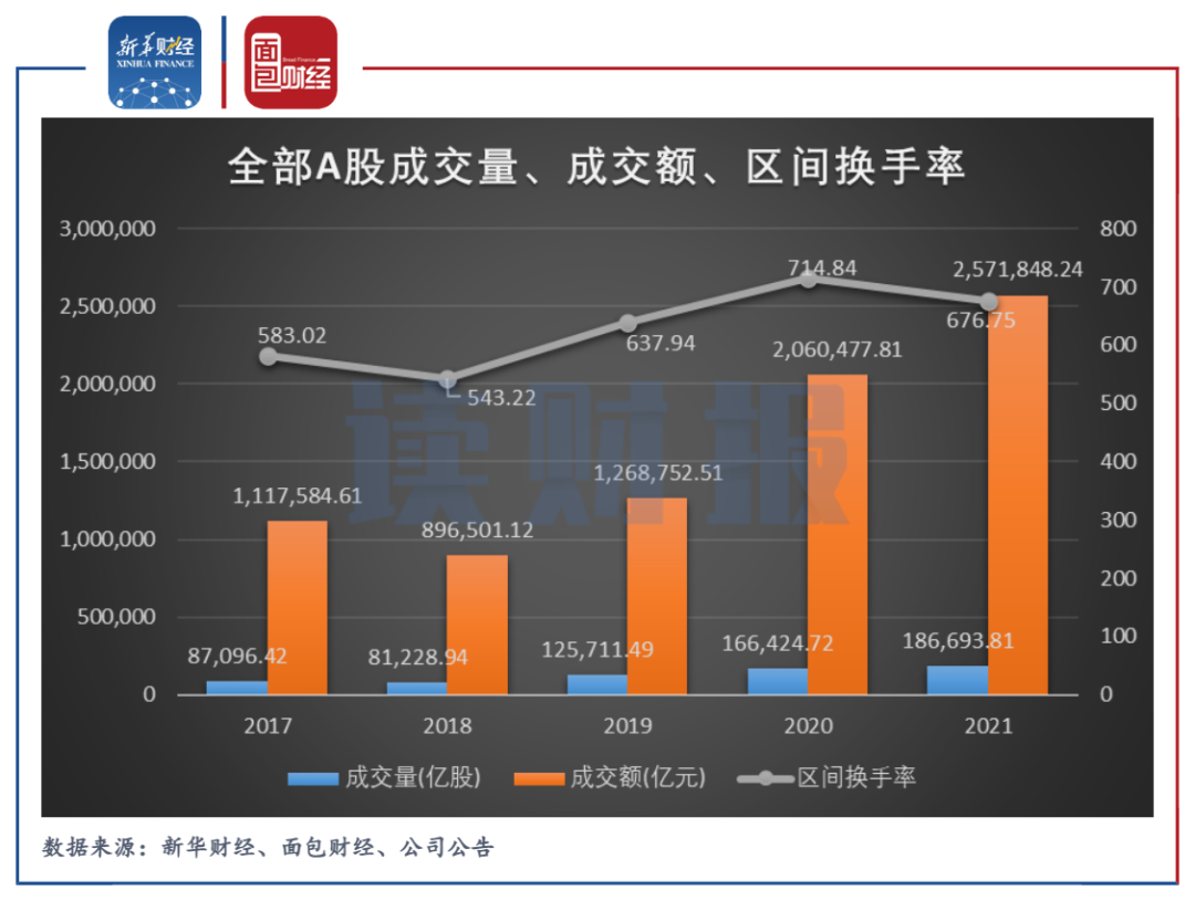 数据统计显示,2021年全部A股的总成交量和总成交额分别为18.67万亿股和257.18万亿元,分别同比增加12.18%和24.82%。当期A股的区间换手率虽较上年有所下滑,但总体仍保持较高的水平,结合成交量和成交额双增长,2021年A股整体交投较活跃,这或是促使券商业绩普遍增长的原因之一。