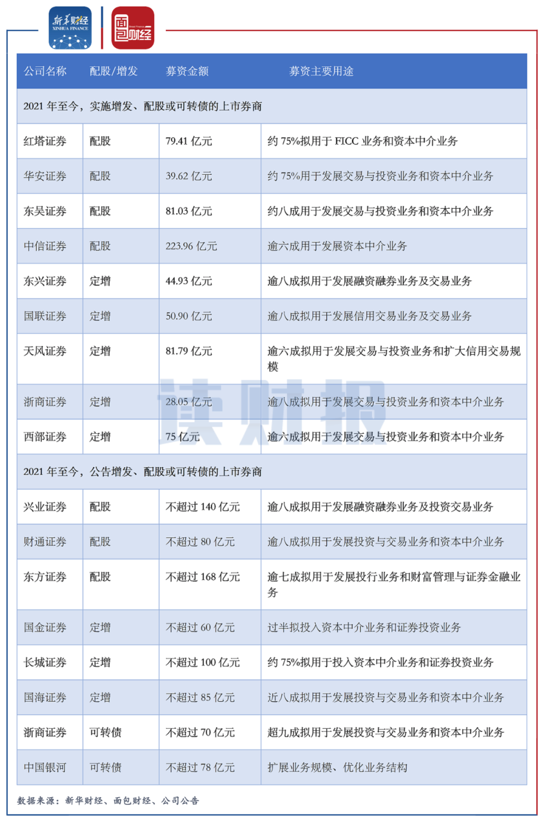 为了应对市场竞争,多家券商通过增发、配股或发行可转债等方式募资补血。