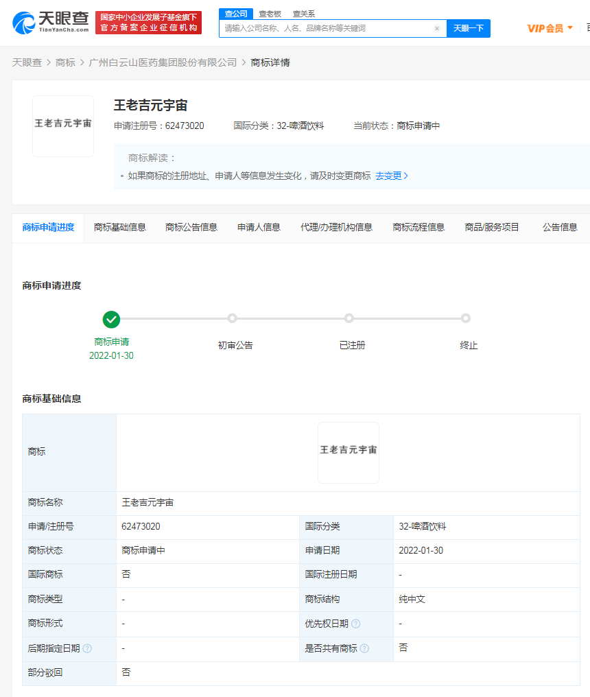 天眼查App显示,近日,王老吉关联公司广州白云山医药集团股份有限公司申请注册“王老吉元宇宙”商标,国际分类为啤酒饮料,当前商标状态为申请中。