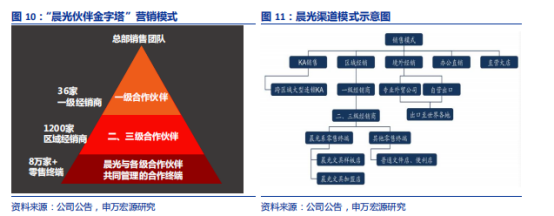 2008年,晨光文具在行业内率先采取连锁加盟模式,逐步建成“层层投入、层层分享”的“晨光伙伴金字塔”营销模式,与各级经销商共同建立了“稳定、共赢”的分销体系。