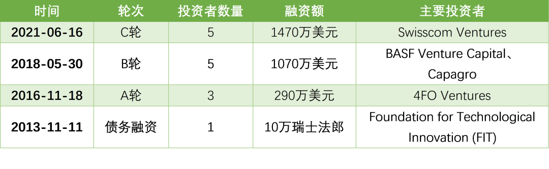 Ecorobotix从成立以来,共进行了四轮融资。第一次融资是在2013年进行的债务融资,获得10万瑞士法郎的资金。在2016年进行A轮融资,获得资金290万美元。2018年完成B轮融资,获得资金1070万美元,2021年完成C轮融资,获得资金1470万美元。
