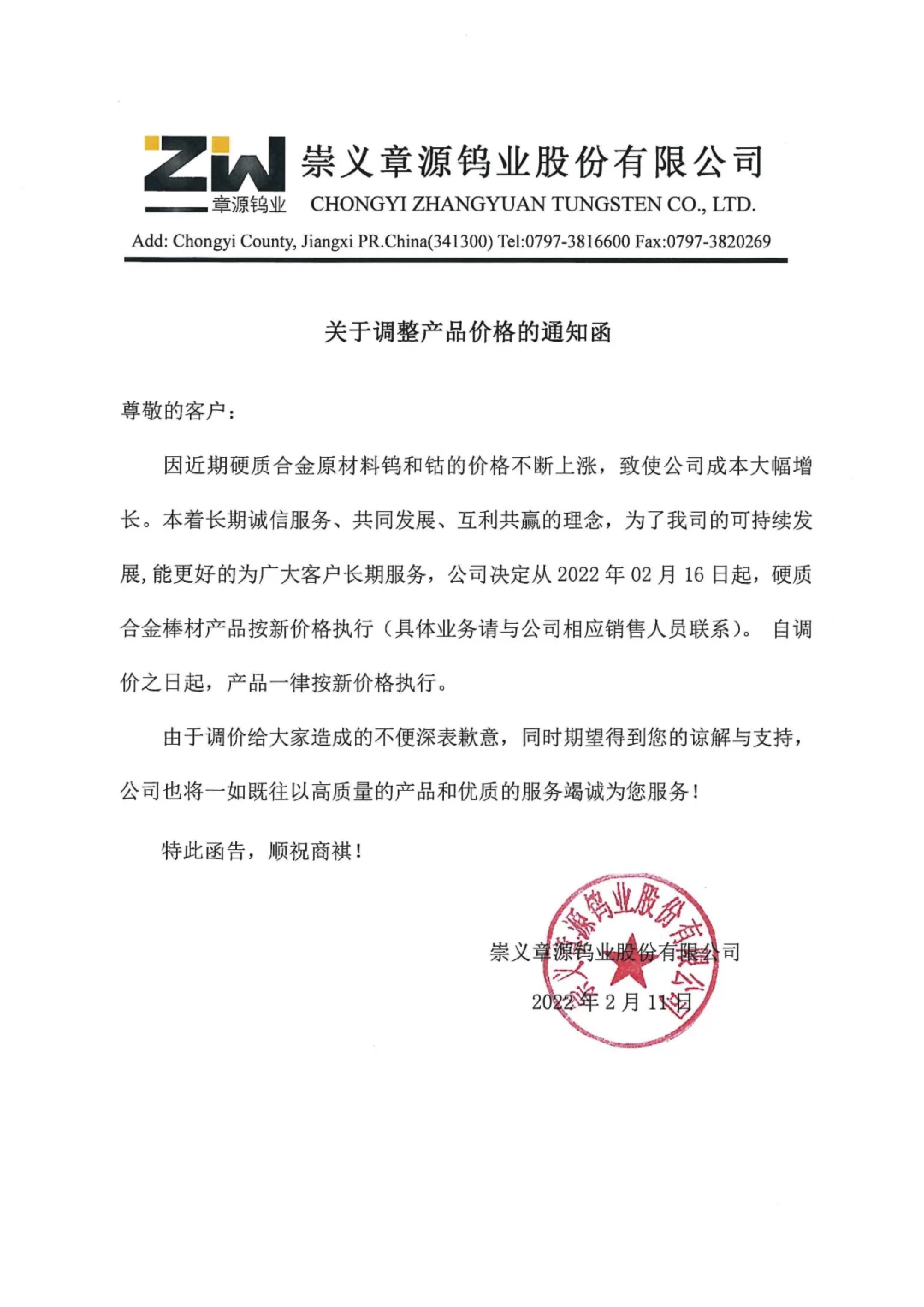 2月11日,章源钨业发布调价通知:因近期硬质合金原材料钨和钴的价格不断上涨,致使公司成本大幅增长,公司决定从2022年2月16日起,硬质合金棒材产品按新价格执行。自调价之日起,产品一律按新价格执行。