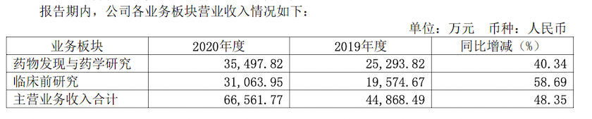 公开资料显示,美迪西是一家CRO企业(即Contract Research Organization,合同研究组织),主营业务为通过研发技术平台,向制药企业及科研单位提供药物发现与药学研究、临床前研究的医药研发服务。根据2020年财报,美迪西的营业收入中,临床前CRO业务占比接近100%。临床前CRO业务又包括临床前研究、药物发现和药学研究等。2018年到2020年,美迪西的药物发现业务增速迅猛,年均复合增长率为46.82%,高于公司整体业务的增长速度。