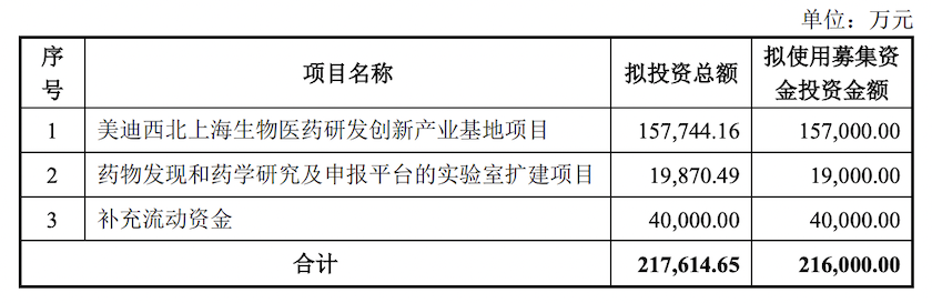 根据公告,美迪西拟募集的21.6亿元中,有15.7亿元拟用于美迪西北上海生物医药研发创新产业基地项目,募投资金将主要用于新增药物发现业务相关的实验室及机器设备。另有1.9亿元拟用于药物发现和药学研究及申报平台的实验室扩建项目,4亿元拟用于补充流动资金。