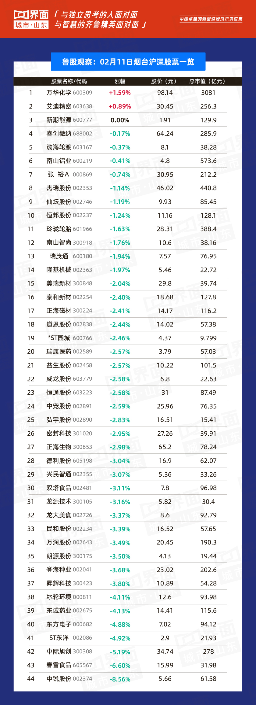 烟台市涨幅榜首:万华化学(600309),涨幅:1.59%,股价98.14元,总市值3081亿元;