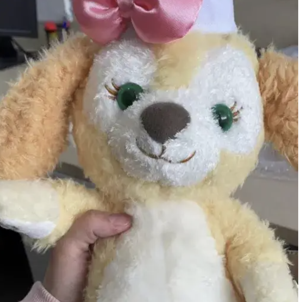 图片上是达菲家族中的“饼饼”可琦安,饼饼的形象是一只黄色的垂耳狗,头戴一顶厨师帽。尽管是正版,但这只饼饼长得显然不够甜美可爱:头部歪斜、双眼和嘴巴不对称,脸型也不饱满圆润。