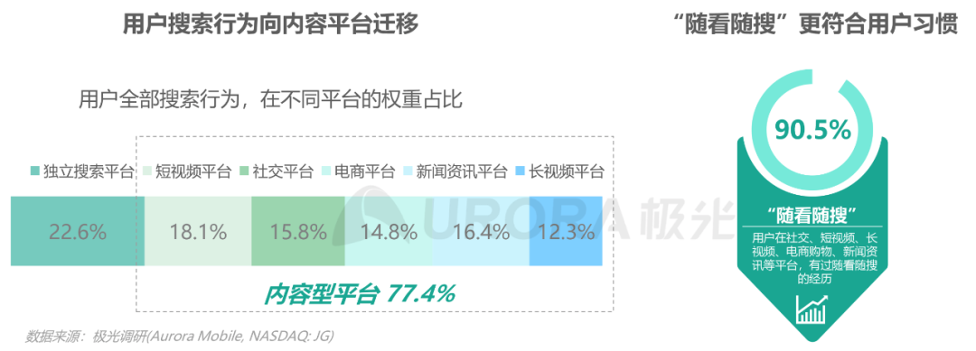 此外,用户的所有搜索行为中,有77.4%的搜索会发生在内容型平台;90.5%的用户在社交、短视频、长视频、电商购物、新闻资讯等平台。