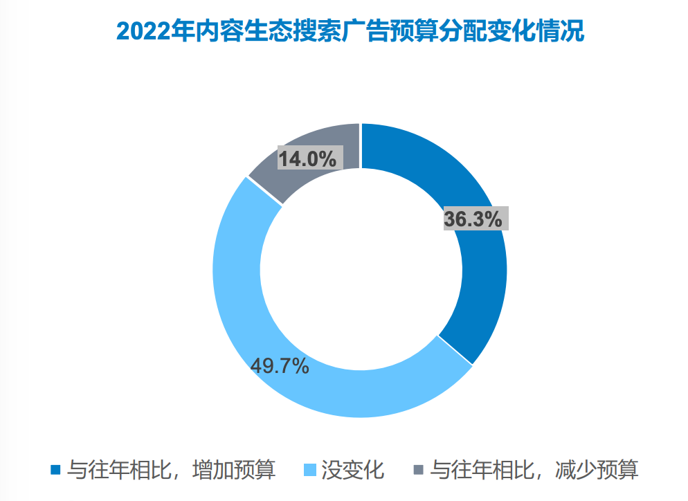 根据CTR央视市场研究发布的《2022年搜索营销预算趋势报告》,调研数据显示,预计2022年36.3%的广告主在内容生态搜索广告上增加预算,广告主认可内容生态搜索广告是新流量/新形式。
