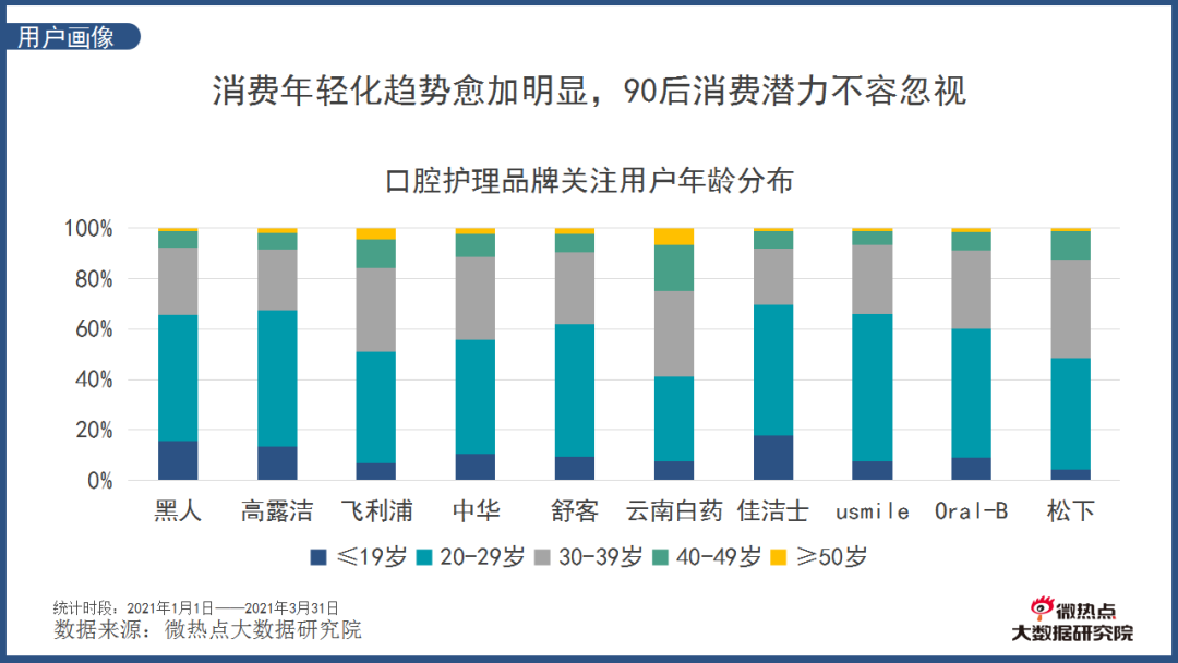 新动作的确为舒客吸引了一批年轻用户,但依然不敌部分老品牌。据微热点大数据研究院发布的《2021年一季度口腔护理行业网络关注度分析报告》显示,舒客的品牌关注度,在29岁以下用户群体中占比超过60%,仍落后于黑人、高露洁和佳洁士等老品牌。