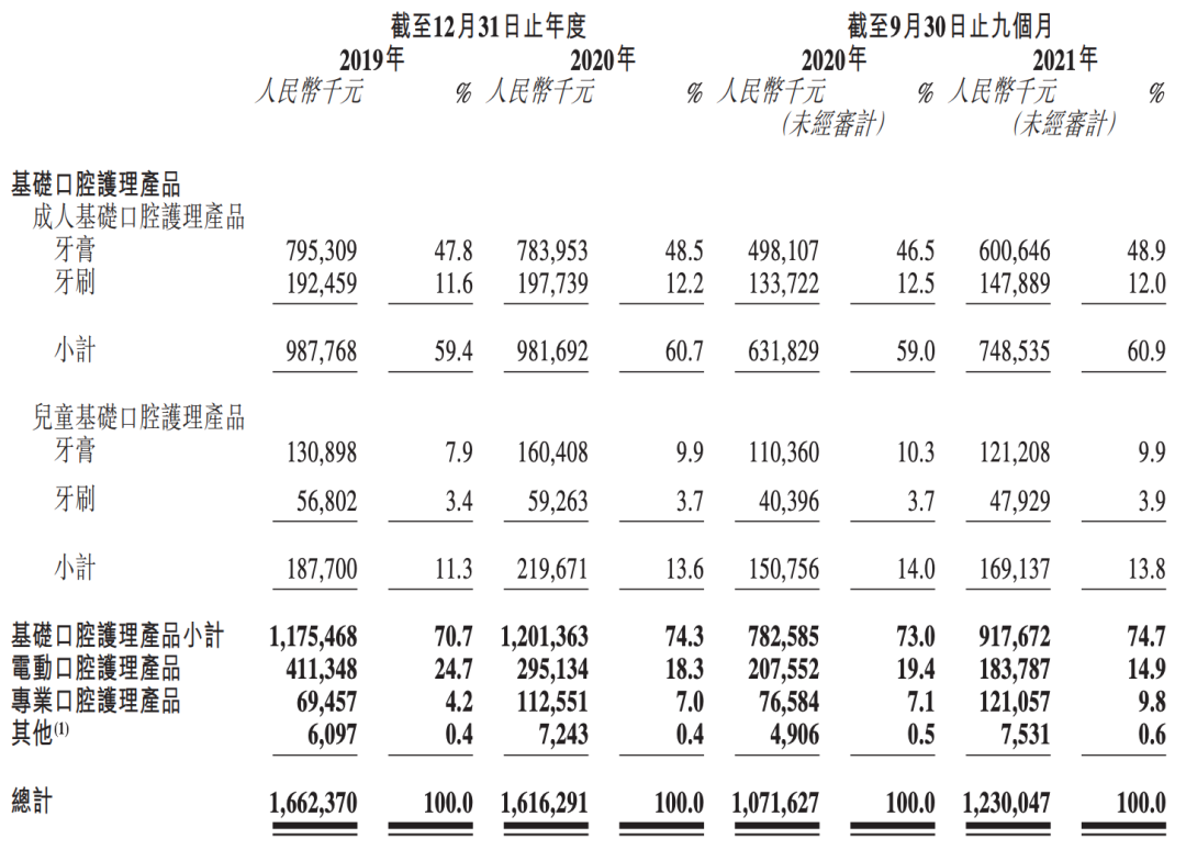 舒客的口腔护理产品线分为基础、电动和专业,牙膏牙刷依旧是主业。且各部分占比相对稳定,在报告期内(2019年至2021年前九个月)都保持着7:2:1的比例。