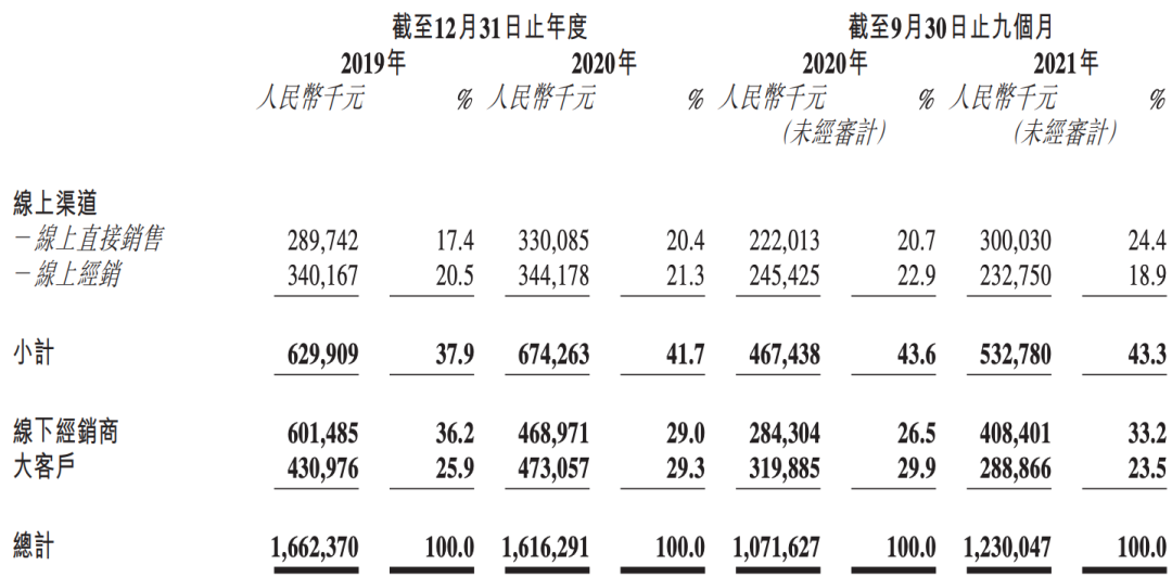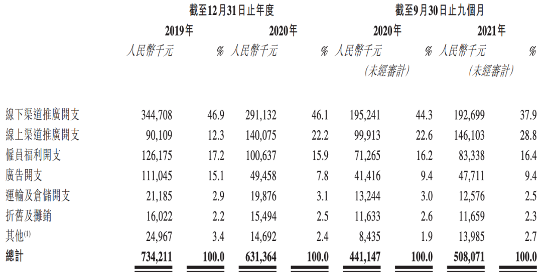 如今薇美姿更多的是利用小红书、抖音等社交媒体触达年轻消费群体,这些营销动作也不便宜。招股书显示,薇美姿线上渠道的推广开支从2019年的12.3%,增长到了2021年前三季度的近30%,至今依然保持一年6亿多的广告开支。