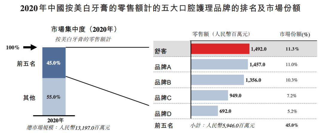 据薇美姿招股书给出的数据,按2020年美白牙膏的零售额计,国内五大品牌共占45%的市场份额,舒客在中国美白牙膏市场中排名第一,占11.3%。