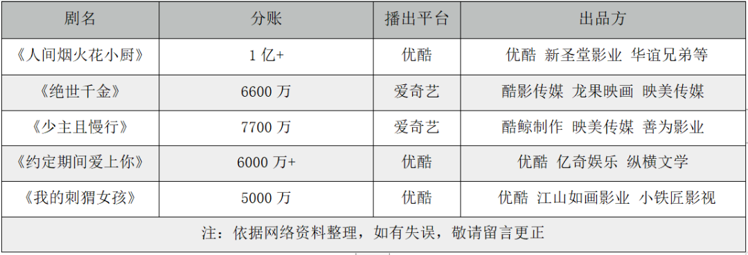 据文娱君统计,2019年至2020年这两年间,爱优腾内斩获1000万~5000万的分账剧超10部,破5000万的有5部之多,2020年初在优酷上线独播的《人间烟火花小厨》更直接让分账剧进入“亿时代”。