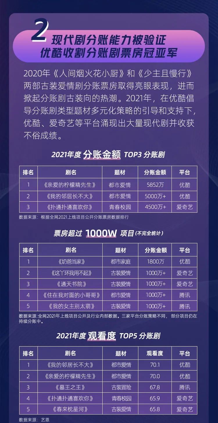 据《优酷内容开放平台2021年度报告》(下文简称《报告》),平台《亲爱的柠檬精先生》《我的邻居长不大》分别以5852万、5000万+分账收益斩获2021年度分账剧票房TOP1、TOP2,爱奇艺《扑通扑通喜欢你》以4500万+分账收益占据TOP3。