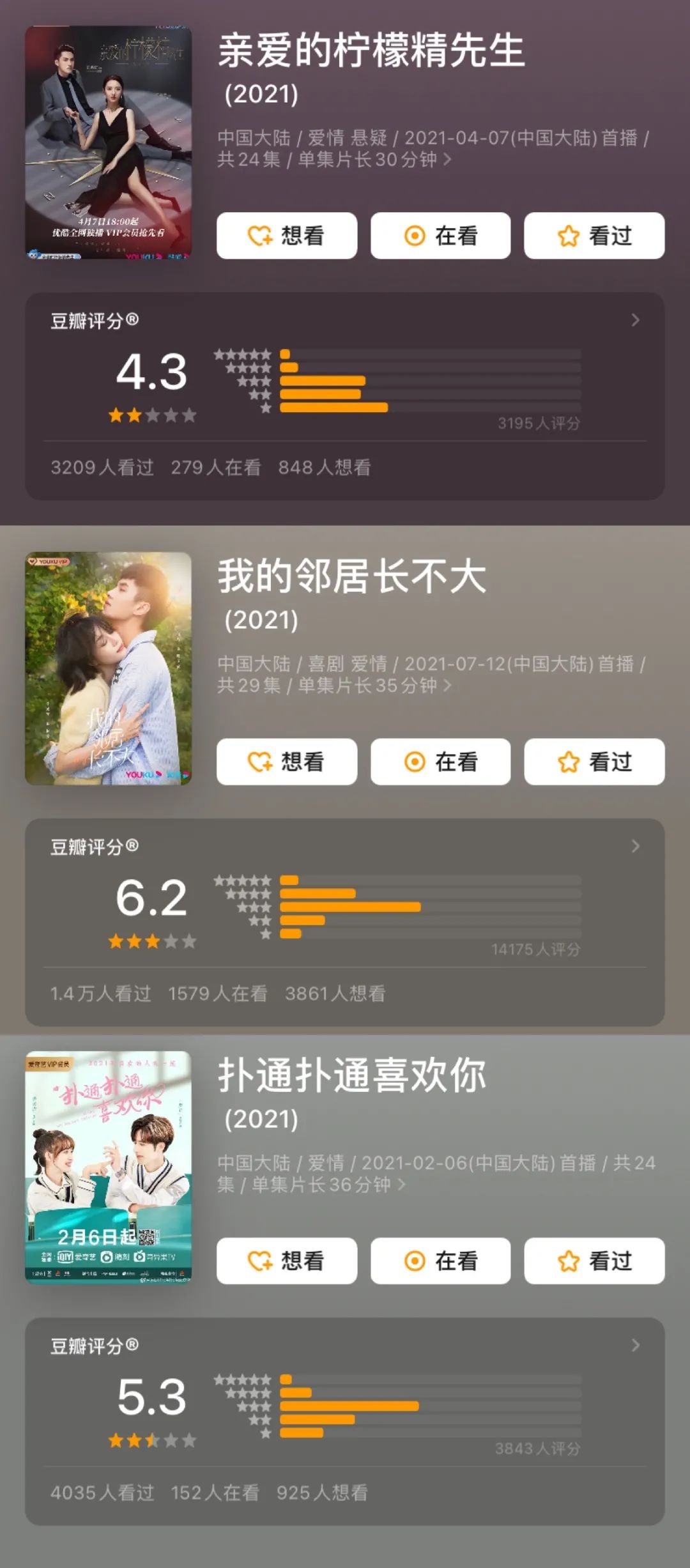 不仅如此,处于年度TOP3的《我亲爱的柠檬精先生》《我的邻居长不大》《扑通扑通喜欢你》中,只有《我的邻居长不大》豆瓣评分勉强过6分。