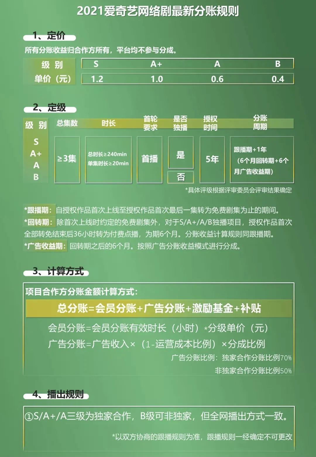 据爱奇艺在2021年12月1日起推出的全新分账规则,平台将此前基于会员点击分账的会员分账收益判定转变为会员观看时长分账,项目合作方获得广告分账比例分为独家分账比例7:3,非独家合作方分账比例5:5。