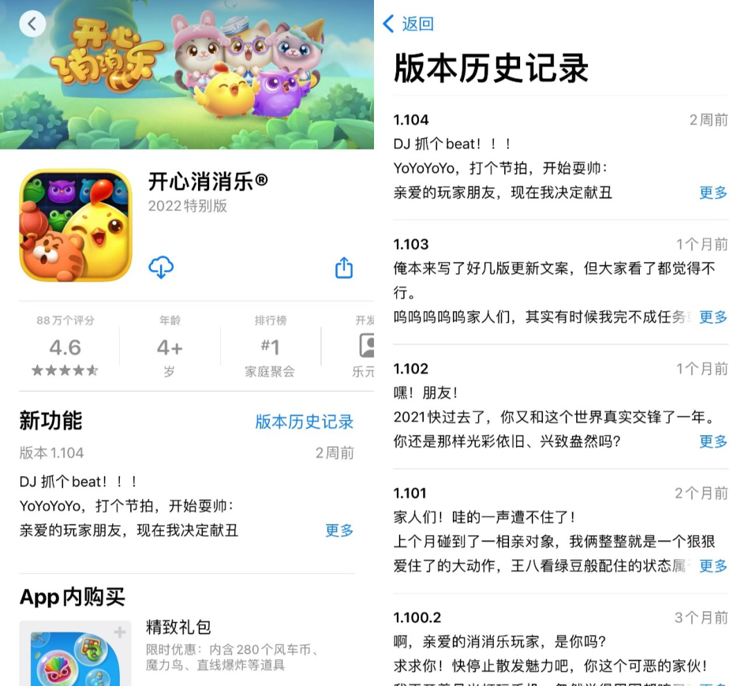 作为一款老少咸宜充斥着逗逼气质的游戏,其实更还原“电车上摁计算器”的手游本质:毕竟你很难一只手玩《王者荣耀》,但你可以靠一根手指搓消消乐。逗逼气质贯穿到了玩家和开发组,成了一起开心的社会人。