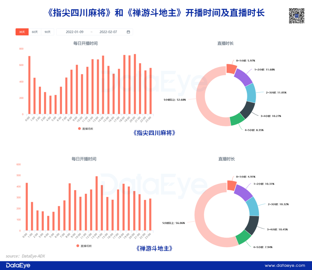 根据DataEye-ADX数据,以《指尖四川麻将》和《禅游斗地主》为例,2022年1月,两款游戏均加大直播力度,这也与游戏公司的投放策略相关,进入春节,整体素材投放量有明显增长。