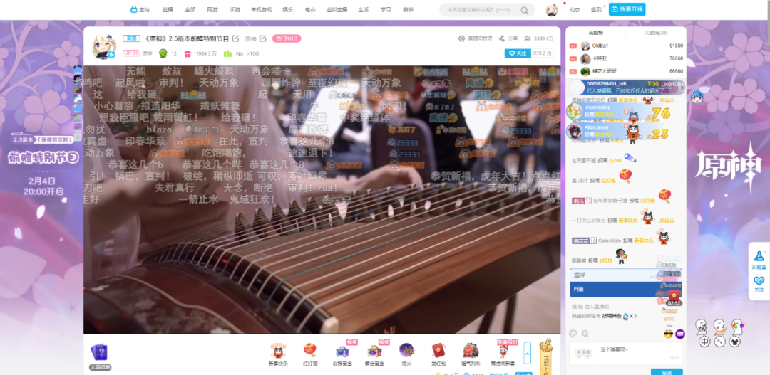 《原神》B站直播间人气超过3380万,稳居当晚直播人气榜首