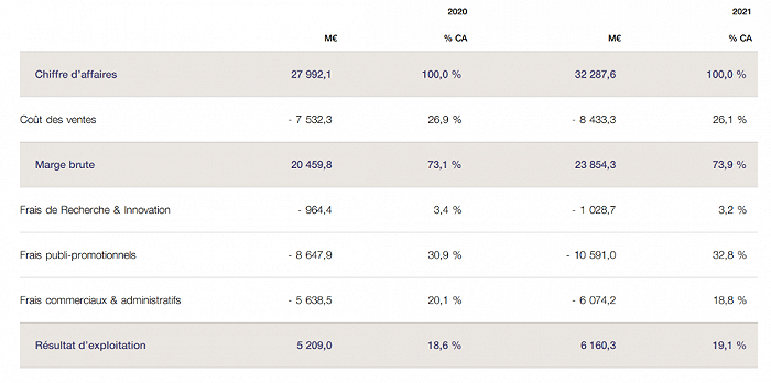 2月10日,欧莱雅集团发布2021全年财报显示,2021年销售额实现322.8亿欧元(约合人民币2345.0亿元),同比增长16.1%;相较于2019年,欧莱雅集团销售额同比增长11.3%;营业利润达61.6亿欧元,占销售额的19.1%。