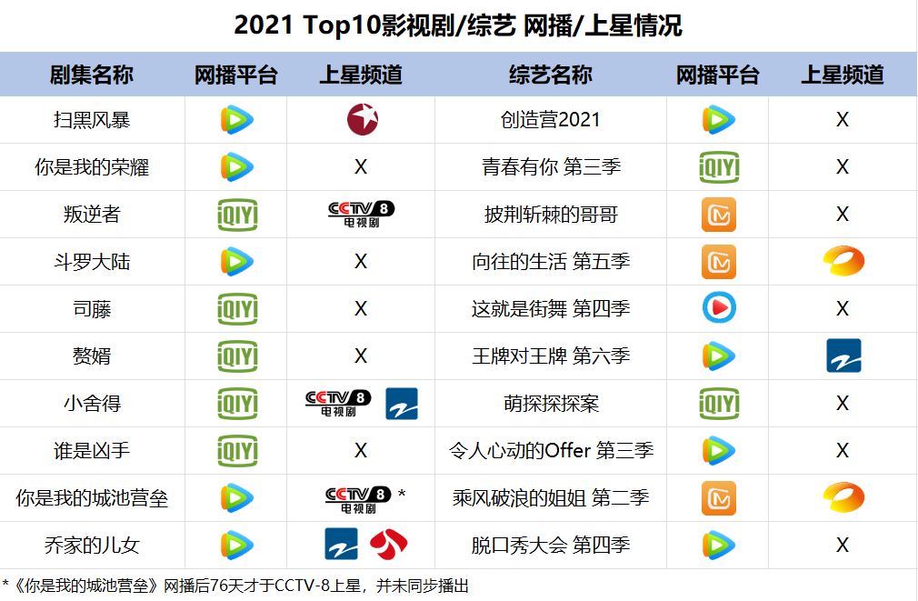 根据艺恩数据的《2021综艺年度洞察报告》与《2021年国产剧集市场研究报告》,我们整理了2021年播映指数Top10的影视剧和综艺的网播及上星情况。