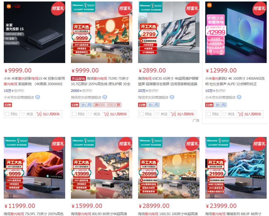 搜索各大电商网站也可发现,小米,海信,长虹,东芝等电视制造企业也已纷纷入局激光显示产品,且都推出了自己的激光电视,价格在1万元-2万元不等,相比动辄售价5万元以上的同尺寸液晶电视产品便宜不少。