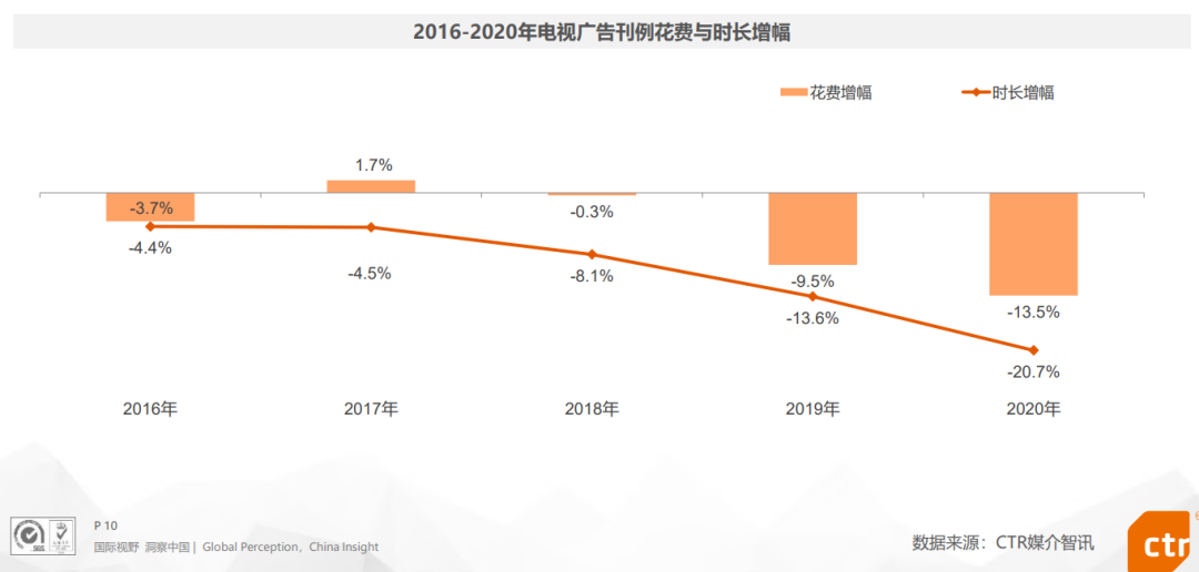 电视广告的时长,在近五年间更是持续减短,2016,2017年的电视广告时长分别缩短了4.4%,4.5%,2018年缩短了8.1%,2019年和2020年更是缩短了13.6%与20.7%,累计缩短的广告时长接近三分之一,可见电视广告的颓势之明显。